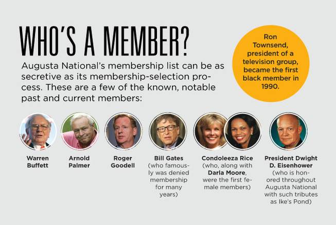 공개된 회원으로는 마이크로 소프트의 빌 게이츠, 버크셔 해서웨이의 워렌 버핏, 최초의 흑인여성 국무장관을 역임한 콘돌리자 라이스, 대통령으로서는 처음이자 마지막 회원이었던 드와이트 아이젠하워, 제네럴 일렉트릭의 회장 잭 웰치 등이 있고 골퍼로는 잭 니클라우스와 아놀드 파머가 오거스타 내셔널의 정회원이었다.