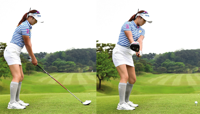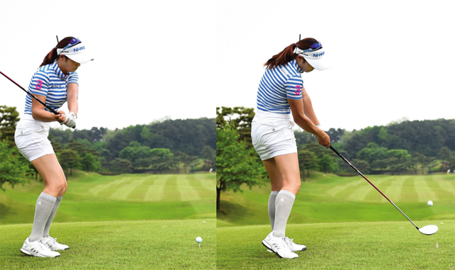스윙의 힘을 유지하기 위해 양무릎의 각도를 작게 만들며 클럽을 끌어내리고 있다. 이때 중요한 하체의 체중이동 또한 정확하게 이뤄지는 모습이다.