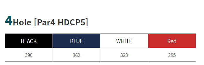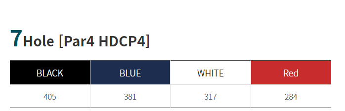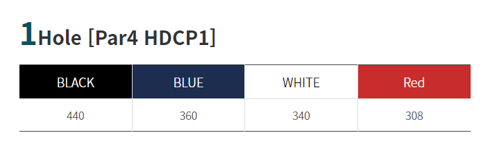 거리 440m, 12m. 경기상 거리는 460m 정도이며 그린 사이의 연못은 90m 정도의 Carry Over를 요구하고 있습니다.