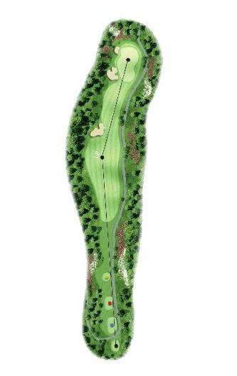 거리 405m, 36m Par4 홀로서 Play상 거리는 370m 정도로 tee shot으로는 IP 왼쪽을 겨냥해가야 그린 정복이 쉬운 전략성을 띄고 있습니다.