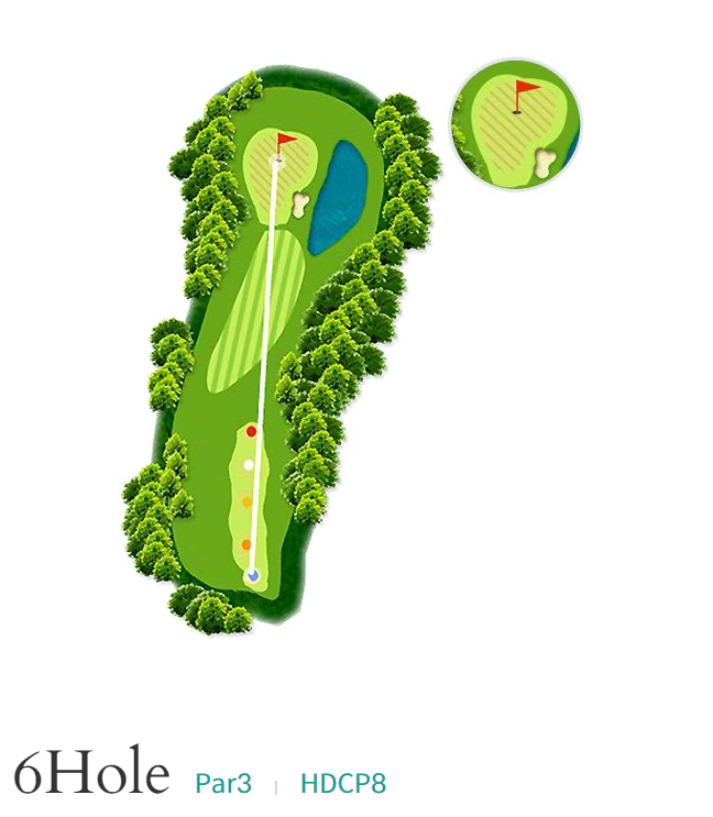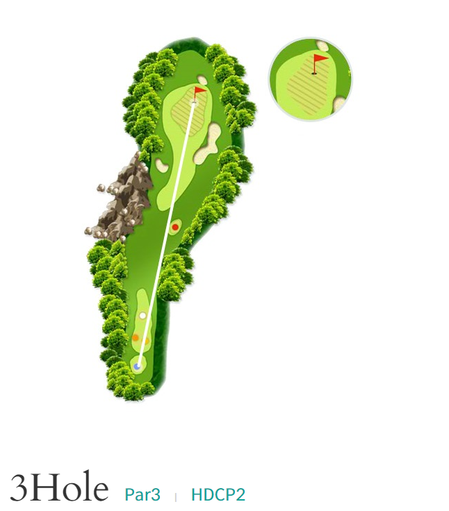 페어웨이가 모두 워터해저드로 된 홀로 반드시 해저드를 넘겨야 하는 부담이 큰 홀입니다. 그러나 평소 거리보다 한 클럽 더 잡고 그린 중앙을 향해 공략하면 기대 이상의 스코어도 가능합니다.