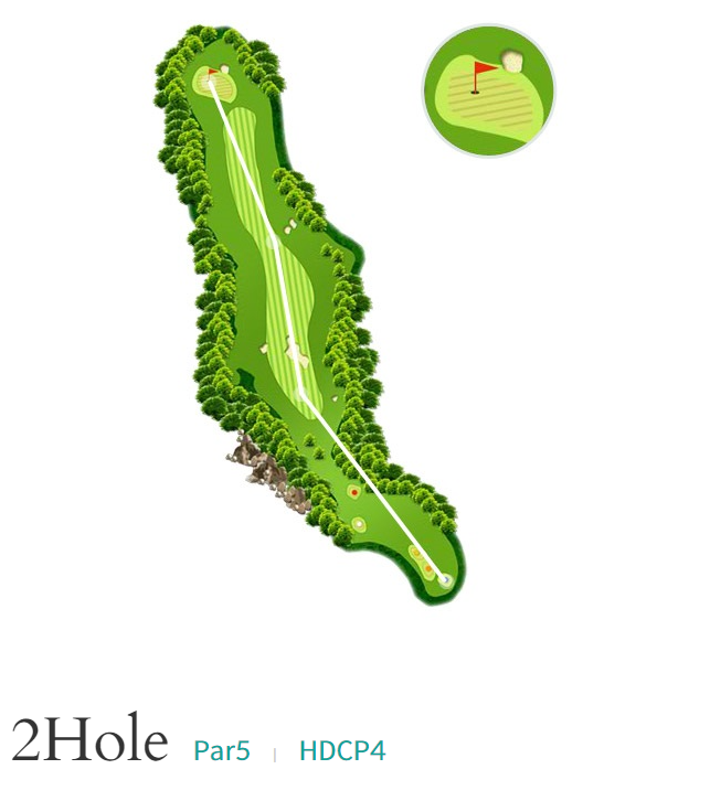 내리막에서 오르막으로 이어지는 좌측 도그렉홀로 좌측 페널티구역, 우측 OB 입니다. 세컨드샷은 좌측의 페널티구역을 건너는 공략보다는 해저드 우측이 안전하고 좌측으로 경사진 2단 그린을 고려한 정확한 서드샷이 필요한 홀입니다.