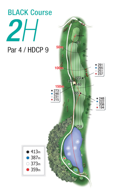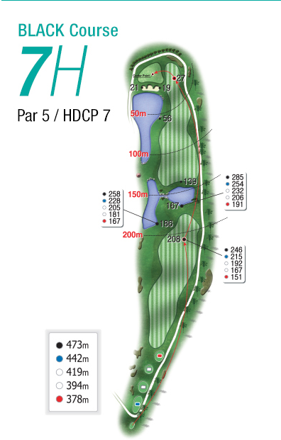 블랙코스는 좌측이 언덕 지형인 파5홀로 티샷시 슬라이스 위험이 있는 홀로 시작됩니다.