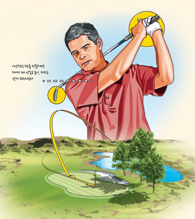 볼 뒤쪽에서 몇 번 연습 스윙을 하면서 양손은 높게 가져가고 헤드는 낮게 가져가는, 즉 헤드가 오른어깨보다 더 낮은 피니시를 취한다. 이렇게 ‘양손은 높이, 헤드는 낮은 피니시’를 몇 번 연습한 뒤 원하는 샷을 머릿속으로 그린다. 이어 볼에 다가서서 실제 스윙을 구사하며 똑같은 피니시를 만든다.