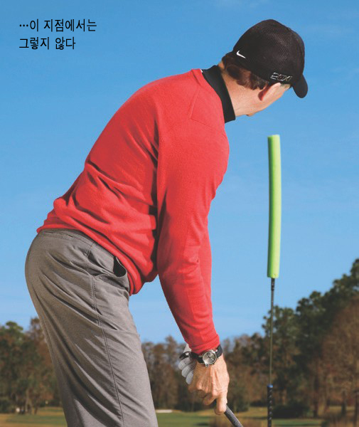 타깃 라인을 마지막으로 한번 바라본다. 어드레스 때의 관점에서 보면 막대가 타깃의 오른쪽으로 10야드 정도 지점에 위치한 것으로 보이게 된다. 이는 잘못된 것이 아니다.