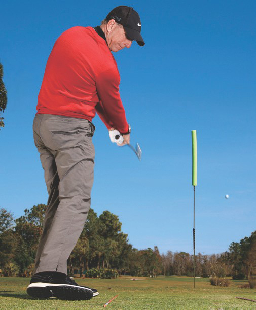 타깃 라인 선상의 볼 앞쪽 10야드 지점에 정렬 막대를 꽂아 놓는다(보다 명확하게 보이게 하려면 누들 튜브를 추가해도 좋다).