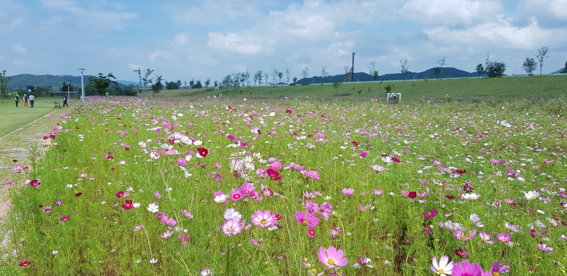 도개파크골프장 옆에 구미시에서 조성한 도개풀라워 단지 중 코스모스 단지 전경입니다. 약 1만평 규모인데 아직 코스모스가 활짝 피지 않아 아쉽네요.