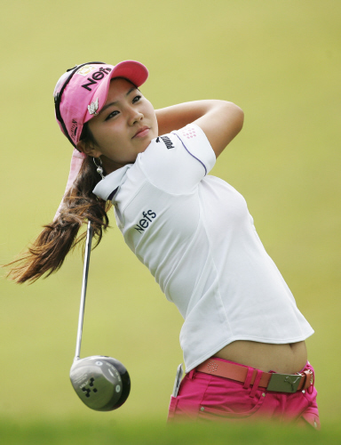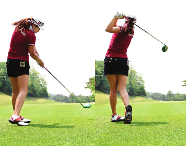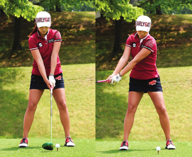 오른무릎을 주목해보자. 오른발바닥의 마찰을 이용해 상체를 비트는데, 이때 오른무릎이 조금이라도 오른발 엄지발가락보다 우측으로 가거나 빠지면 샷거리를 내는 꼬임을 만들 수 없다. 양수진은 백스윙톱까지 몸 비틀림이 매우 이상적이다.