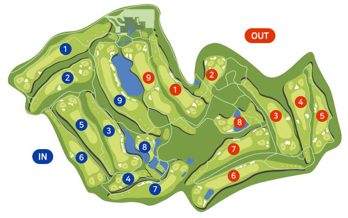 넓은 페어웨이와 인공못(워터 해저드)을 활용한 홀이 존재하며, 미들홀 3곳에는 인공 못이 전체 코스를 휘도는 형태로 배치되어 있습니다.
